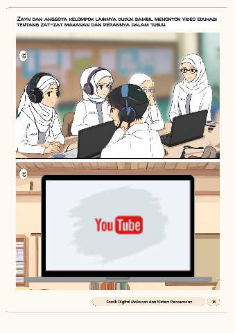 Zayn dan anggota kelompok lainnya duduk sambil menonton video edukasi tentang zat-zat makanan dan perannya dalam tubuh. C C Komik Digital Makanan dan Sistem Pencernaan 16