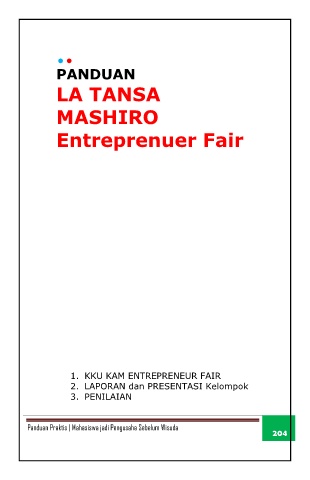 PANDUAN LA TANSA MASHIRO Entreprenuer Fair 1. KKU KAM ENTREPRENEUR FAIR 2. LAPORAN dan PRESENTASI Kelompok 3. PENILAIAN Panduan Praktis | Mahasiswa jadi Pengusaha Sebelum Wisuda 204