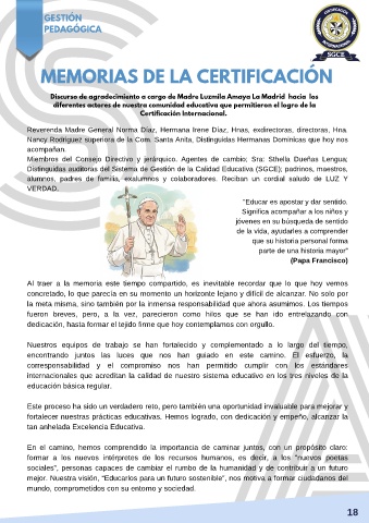 Discurso de agradecimiento a cargo de Madre Luzmila Amaya La Madrid hacia los
