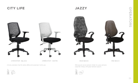 CITY LIFE JAZZY OPERATORS OPERATOR - BLACK OPERATOR - WHITE HIGH-BACK MID-BACK A funky operator chair for urban office and suburban home use. Still popular as an operator chair, the Jazzy delivers value for money, with great lumbar support. 25