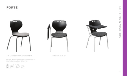 FORTÉ MEETING & VISITORS 4–LEGGED UPHOLSTERED SEAT WRITING TABLET Our new, virtually indestructible poly-shell chair, is ideal for training, utility or visitor chair. 35