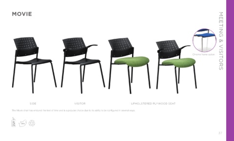 MOVIE Chrome frame option MEETING & VISITORS SIDE VISITOR UPHOLSTERED PLYWOOD SEAT The Movie chair has endured the test of time and is a popular choice due to its ability to be configured in several ways. 37