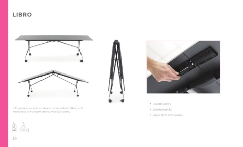 LIBRO • Lockable castors Fold-up frame, available in chrome or charcoal finish. Sliding lock • Excludes work-top mechanisms for increased stability when fully opened. • Various frame sized available. 50