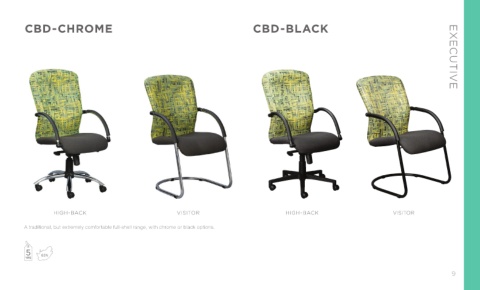 CBD-CHROME CBD-BLACK EXECUTIVE HIGH-BACK VISITOR HIGH-BACK VISITOR A traditional, but extremely comfortable full-shell range, with chrome or black options. 9