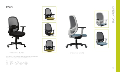 EVO OPERATORS OPERATOR - BLACK OPERATOR - WHITE This generic chair has now been re-designed with improved finishes and supplies with a moulded foam seat. 19