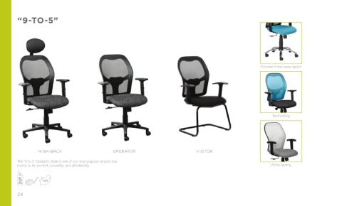 “9-TO-5” Chrome 5-star base option Teal netting HIGH-BACK OPERATOR VISITOR The “9 to 5’ Operator chair is one of our most popular ranges due mainly to its comfort, versatility and affordability. White netting 24