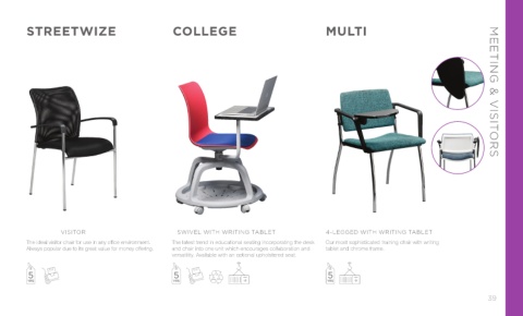 The ideal visitor chair for use in any office environment. The latest trend in educational seating incorporating the desk Our most sophisticated training chair with writing