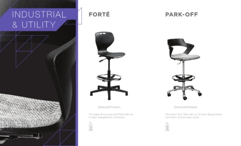 INDUSTRIAL FORTÉ PARK-OFF & UTILIT Y DRAUGHTSMAN DRAUGHTSMAN The super-strong poly-shell fitted with our This funky chair, fitted with our hi-reach draughtsman hi-reach draughtsman conversion. conversion and alu-base option. 40