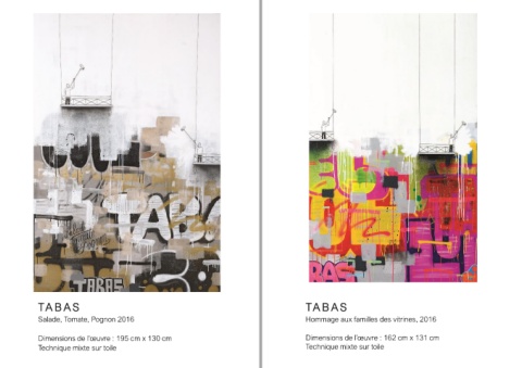 TA B A S TA B A S Salade, Tomate, Pognon 2016 Hommage aux familles des vitrines, 2016 Dimensions de l’œuvre : 195 cm x 130 cm Dimensions de l’œuvre : 162 cm x 131 cm Technique mixte sur toile Technique mixte sur toile