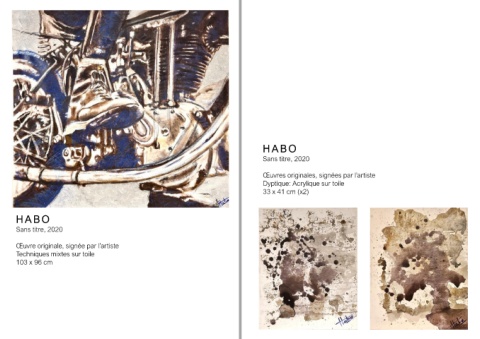 H A B O Sans titre, 2020 Œuvres originales, signées par l’artiste Dyptique: Acrylique sur toile 33 x 41 cm (x2) H A B O Sans titre, 2020 Œuvre originale, signée par l’artiste Techniques mixtes sur toile 103 x 96 cm