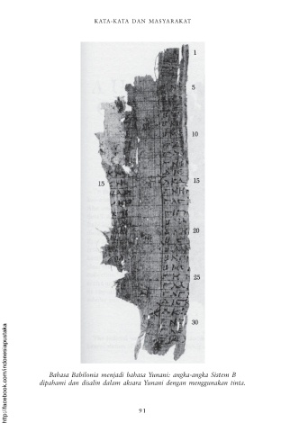 KATA-KATA DAN MASYARAKAT http://facebook.com/indonesiapustaka dipahami dan disalin dalam aksara Yunani dengan menggunakan tinta. Bahasa Babilonia menjadi bahasa Yunani: angka-angka Sistem B 91