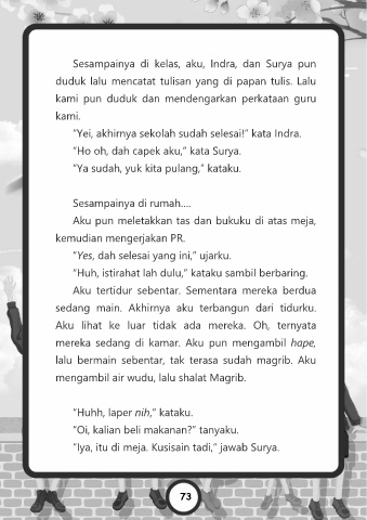 “Yei, akhirnya sekolah sudah selesai!” kata Indra.