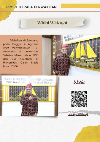 PROFIL KEPALA PERWAKILAN Widhi Widayat Dilahirkan di Bandung pada tanggal 4 Agustus 1969. Menyelesaikan S1 Akuntansi di Universitas Sebelas Maret tahun 1996 dan S-2 Akuntansi di Universitas Gajah Mada tahun 2006. Widhi bit.ly/39WwrgX