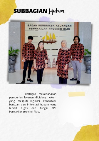 SUBBAGIAN Hukum Bertugas melaksanakan pemberian layanan dibidang hukum yang meliputi legislasi, konsultasi, bantuan dan informasi hukum yang terkait tugas dan fungsi BPK Perwakilan provinsi Riau.