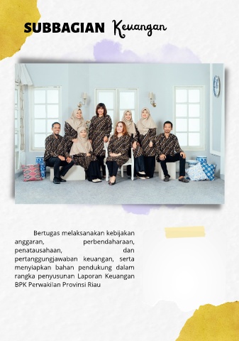 SUBBAGIAN Keuangan Bertugas melaksanakan kebijakan anggaran, perbendaharaan, penatausahaan, dan pertanggungjawaban keuangan, serta menyiapkan bahan pendukung dalam rangka penyusunan Laporan Keuangan BPK Perwakilan Provinsi Riau