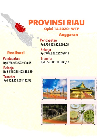PROVINSI RIAU Opini TA 2020 : WTP Anggaran Pendapatan Rp8.736.933.522.998,05 Belanja Realisasi Rp 7.077.928.222.328,13 Pendapatan Transfer Rp8.736.933.522.998,05 Rp1.659.005.300.669,92 Belanja Rp 6.548.368.423.452,39 Transfer Rp1.624.338.051.142,92