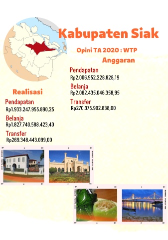 Kabupaten Siak Opini TA 2020 : WTP Anggaran Pendapatan Rp2.006.952.228.828,19 Belanja Realisasi Rp2.062.435.046.358,95 Pendapatan Transfer Rp1.933.247.955.890,25 Rp270.375.902.838,00 Belanja Rp1.827.740.588.423,40 Transfer Rp269.348.443.099,00