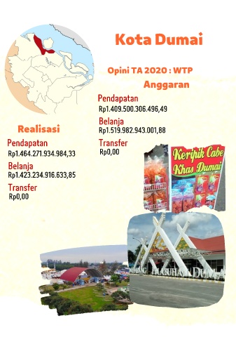 Kota Dumai Opini TA 2020 : WTP Anggaran Pendapatan Rp1.409.500.306.496,49 Belanja Realisasi Rp1.519.982.943.001,88 Pendapatan Transfer Rp1.464.271.934.984,33 Rp0,00 Belanja Rp1.423.234.916.633,85 Transfer Rp0,00