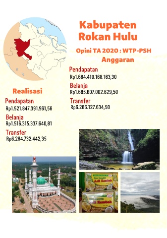 Kabupaten Rokan Hulu Opini TA 2020 : WTP-PSH Anggaran Pendapatan Rp1.684.410.168.163,30 Belanja Realisasi Rp1.685.607.002.629,50 Pendapatan Transfer Rp1.521.847.391.961,56 Rp6.286.127.634,50 Belanja Rp1.516.315.337.640,81 Transfer Rp6.264.732.442,35