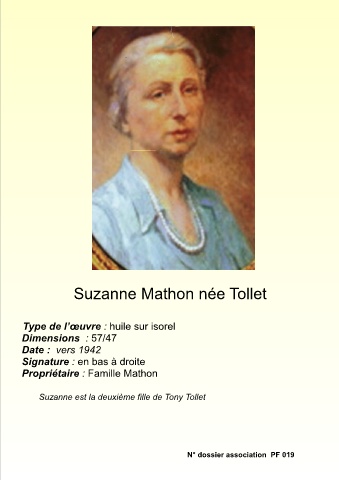 Suzanne Mathon née Tollet Type de l’œuvre : huile sur isorel Dimensions : 57/47 Date : vers 1942 Signature : en bas à droite Propriétaire : Famille Mathon Suzanne est la deuxième fille de Tony Tollet N° dossier association PF 019