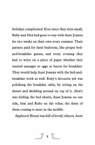 holidays complicated. Ever since they were small, Ruby and Alex had gone to stay with Aunt Joanna for two weeks on their own every summer. Their parents paid for their bedroom, like proper bed- and-breakfast guests, and every evening they had to write on a piece of paper whether they wanted sausages or eggs or bacon for breakfast. They would help Aunt Joanna with the bed-and- breakfast work as well. Ruby’s favourite job was polishing the breakfast table, by sitting on the duster and skidding around on top of it. Alex’s was folding the bed sheets, Aunt Joanna on one side, him and Ruby on the other, the three of them coming to meet in the middle.