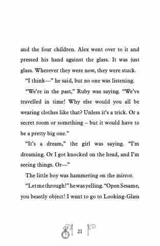 “We’re in the past,” Ruby was saying. “We’ve travelled in time! Why else would you all be wearing clothes like that? Unless it’s a trick. Or a secret room or something – but it would have to be a pretty big one.”