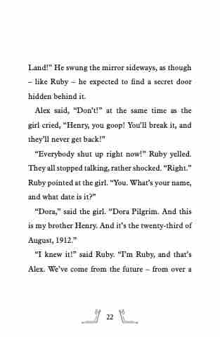 “Dora,” said the girl. “Dora Pilgrim. And this is my brother Henry. And it’s the twenty-third of August, 1912.”