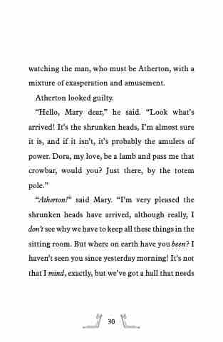 “Hello, Mary dear,” he said. “Look what’s arrived! It’s the shrunken heads, I’m almost sure it is, and if it isn’t, it’s probably the amulets of power. Dora, my love, be a lamb and pass me that crowbar, would you? Just there, by the totem pole.”