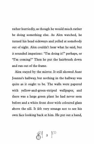 Alex stayed by the mirror. It still showed Aunt Joanna’s hallway, but nothing in the hallway was quite as it ought to be. The walls were papered with yellow-and-green-striped wallpaper, and there was a large green plant he had never seen before and a white front door with coloured glass above the sill. It felt very strange not to see his own face looking back at him. He put out a hand,