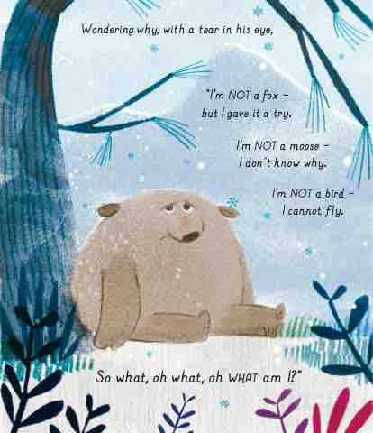 Wondering why, with a tear in his eye, “I’m NOT a fox – but I gave it a try. I’m NOT a moose – I don’t know why. I’m NOT a bird – I cannot fly. So what, oh what, oh WHAT am I?”