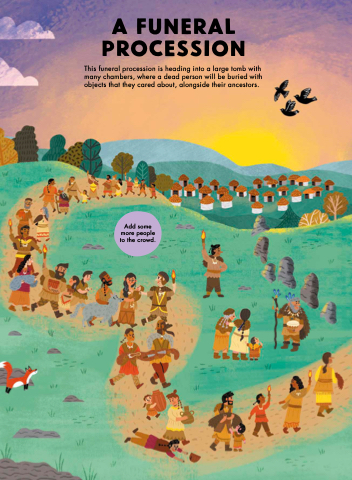 A funeral procession This funeral procession is heading into a large tomb with many chambers, where a dead person will be buried with objects that they cared about, alongside their ancestors. Add some more people to the crowd.