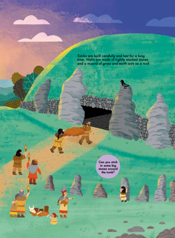 Tombs are built carefully and last for a long time. Walls are made of tightly stacked stones and a mound of grass and earth acts as a roof. Can you stick in some big stones around the tomb