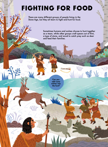 Sometimes humans and wolves choose to hunt together as a team, while other groups craft spears out of flint, a type of stone, and wood to catch prey such as deer and feed their families.
