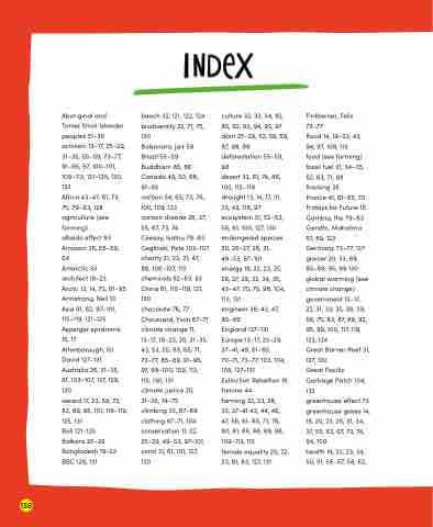 chocolate 76, 77 Chouinard, Yvon 67–71 climate change 11, 13–17, 19–23, 26, 31–35, 43, 53, 55, 63, 65, 71, 73–77, 85–89, 91–95, 97, 99–100, 109, 113, 115, 130, 131