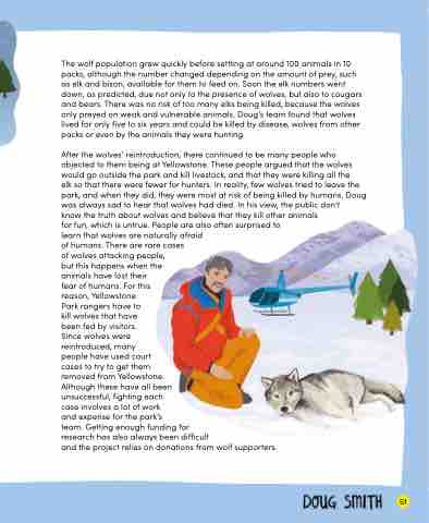 elk so that there were fewer for hunters. In reality, few wolves tried to leave the park, and when they did, they were most at risk of being killed by humans. Doug was always sad to hear that wolves had died. In his view, the public don’t