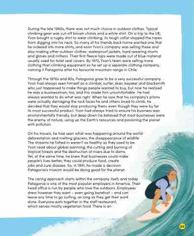 Through the 1970s and 80s, Patagonia grew to be a very successful company. Yvon had always seen himself as a climber, surfer, skier, kayaker and blacksmith who just happened to make things people wanted to buy, but now he realised he was a businessman, too, and this made him uncomfortable. He had
