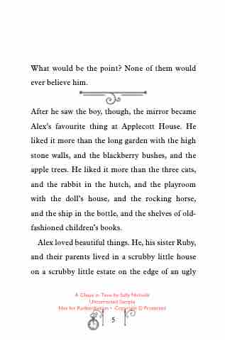 After he saw the boy, though, the mirror became Alex’s favourite thing at Applecott House. He liked it more than the long garden with the high stone walls, and the blackberry bushes, and the apple trees. He liked it more than the three cats, and the rabbit in the hutch, and the playroom with the doll’s house, and the rocking horse, and the ship in the bottle, and the shelves of old- fashioned children’s books.