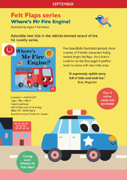 Five beautifully illustrated spreads show a series of friendly characters hiding behind bright felt flaps. And there’s