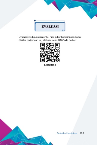 ,, EVALUASI ,, Evaluasi ini digunakan untuk mengukur kemampuan kamu diakhir pertemuan ini, silahkan scan QR Code berikut: Evaluasi 8 Statistika Pendidikan 135