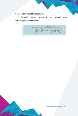 4. Uji-t dua sampel berpasangan Menguji apakah rata-rata dua sampel yang berpasangan sama/berbeda. Statistika Pendidikan 173