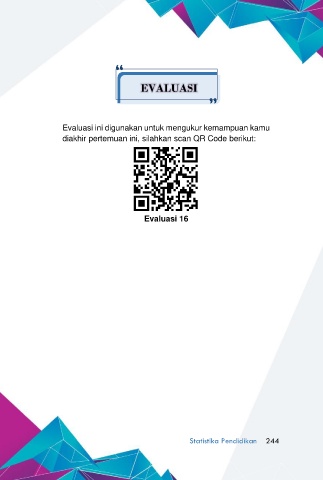 ,, EVALUASI ,, Evaluasi ini digunakan untuk mengukur kemampuan kamu diakhir pertemuan ini, silahkan scan QR Code berikut: Evaluasi 16 Statistika Pendidikan 244