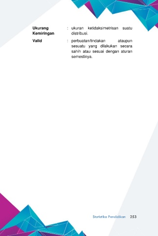 Ukurang : ukuran ketidaksimetrisan suatu Kemiringan distribusi. Valid : perbuatan/tindakan ataupun sesuatu yang dilakukan secara sahih atau sesuai dengan aturan semestinya. Statistika Pendidikan 253