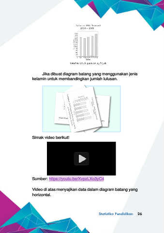 Jika dibuat diagram batang yang menggunakan jenis kelamin untuk membandingkan jumlah lulusan. Simak video berikut! Sumber: https://youtu.be/XvpzLXo3yC4 Video di atas menyajikan data dalam diagram batang yang horizontal. Statistika Pendidikan 26