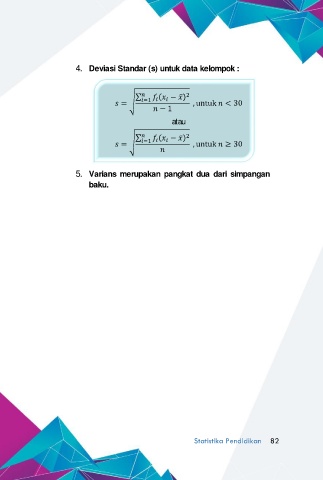 4. Deviasi Standar (s) untuk data kelompok : ∑ ሺ − ሻ 2 ̅ = ඨ =1 , untuk < 30 − 1 atau ̅ ∑ ሺ − ሻ 2 = ඨ =1 , untuk ≥ 30 5. Varians merupakan pangkat dua dari simpangan baku. Statistika Pendidikan 82
