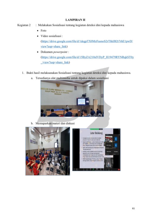 1. Bukti hasil melaksanakan Sosialisasi tentang kegiatan deteksi dini kepada mahasiswa.