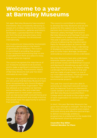 to develop Barnsley Museums and we are grateful for the support of our funding partners Arts Council England and the National Lottery Heritage Fund and to Barnsley Museums and Heritage Trust who have helped us to realise these ambitions. This year in particular there has been