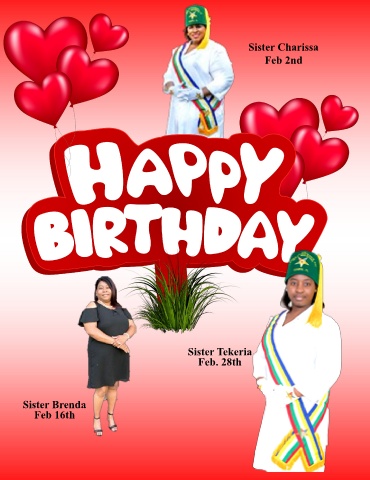Sister Charissa Feb 2nd Sister Tekeria Feb. 28th Sister Brenda Feb 16th