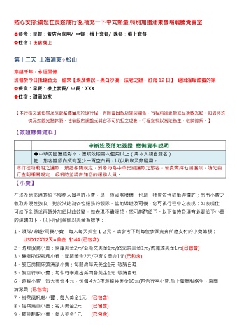 1、領隊/導遊/司機小費:每人每天美金12元。請參考下列每位參團貴賓所應支付的小費總額: