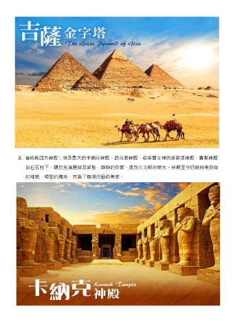 8. ✿經典四大神殿:埃及最大的卡納克神殿、路克索神殿、敬奉雙主神的康夢波神殿,費萊神殿 站在石柱下,讓您充滿震撼及感動,靜靜的欣賞、遙想古文明的偉大。神殿至今仍維持著原始 的樣貌,精密的雕刻,充滿了無限的藝術美感。