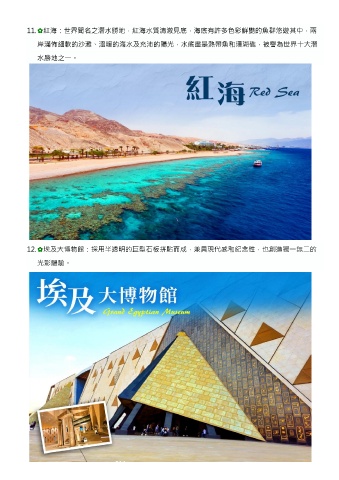 11. ✿紅海:世界聞名之潛水勝地,紅海水質清澈見底,海底有許多色彩鮮艷的魚群悠遊其中,兩 岸滿佈細軟的沙灘、溫暖的海水及充沛的陽光,水底盡是熱帶魚和珊瑚礁,被譽為世界十大潛 水勝地之一。 12. ✿埃及大博物館:採用半透明的巨型石板拼貼而成,兼具現代感和紀念性,也創造獨一無二的 光影體驗。